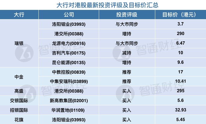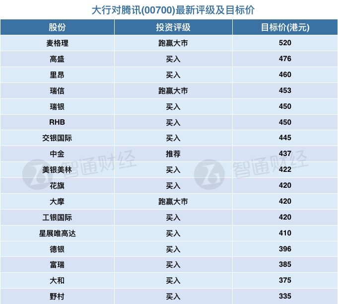 一、大行对腾讯(00700)最新投资评级及目标价汇总