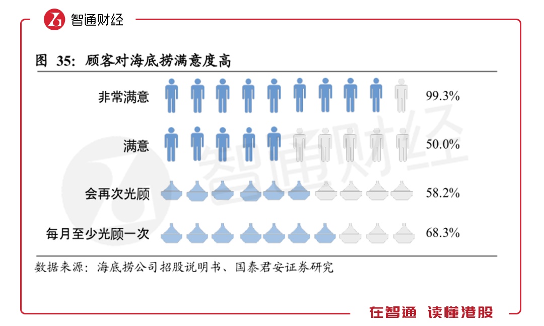 据国泰君安数据显示,用户对海底捞满意度极高,非常满意的用户占比高达99.3%,会再次关顾的比例为58.2%,每月至少关顾一次的比例为68.3%。由此可见海底捞的服务是多么深入人心。