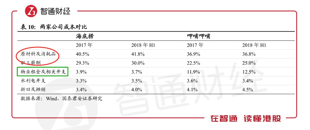 与此同时,注重服务质量的海底捞,不仅营业时间长,且为保证服务质量,员工人数也多于同行,职工薪酬在成本中的比例自然就高于呷哺呷哺。
