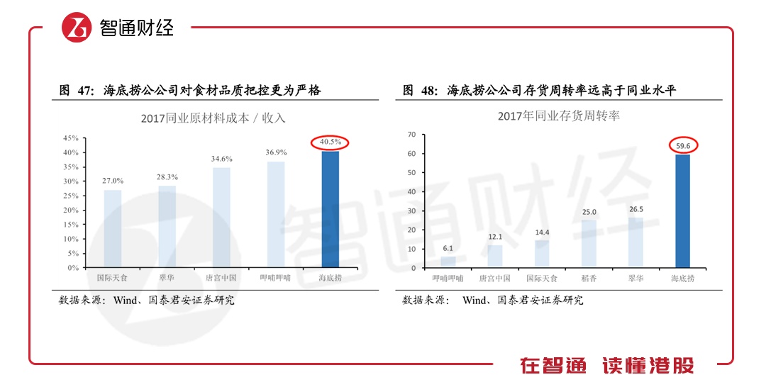 通过数据能看到,海底捞在原材料及消耗品、职工薪酬方面高于呷哺呷哺。海底捞的食材等原材料主要由关联公司蜀海和颐海国际提供,在原材料成本高于同行业的同时,海底捞的原材料存货周转率亦远高于同行,这说明公司食材新鲜,对原材料的把控有较高的要求。