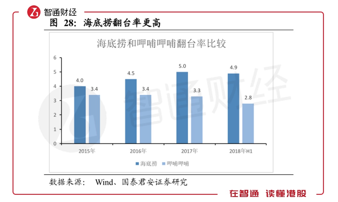 回到国内的大陆市场,海底捞亦是“横扫”同行的存在。2013-2017年,在我国的十大火锅品牌中,虽然海底捞、重庆德庄和呷哺呷哺(00520)从未跌出榜单,但仅有海底捞始终坚持在榜单前五,可见海底捞实力非同一般。