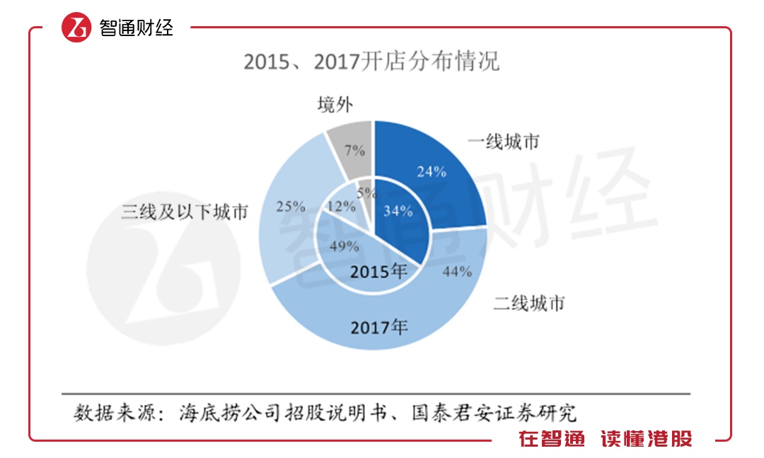 从数据上也能看出海底捞对于三四线城市的布局。2015年时,三线及以下城市开店数占比仅12%,但至2017年,该比例提升至25%,而一二线占比均有所下降。海底捞将持续受益于三四线城市消费升级带来的历史性机遇。