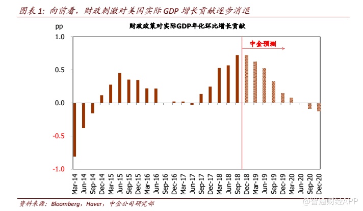 其次,基建计划。此前特朗普总统也计划以联邦政府出资2000亿美元,撬动州及地方政府和私人资金,共投入 1.5 万亿美元用于改善美国基础设施。在民主党掌控众议院背景下,这些财政扩张政 策通过的可能性将显著下降。因而,我们维持此前的基准预测,预计美国的财政刺激(减税+两党财政预算协议)效果将在 2018 年下半年达到高峰后,于 2019 年逐步消退 (图表 1)。