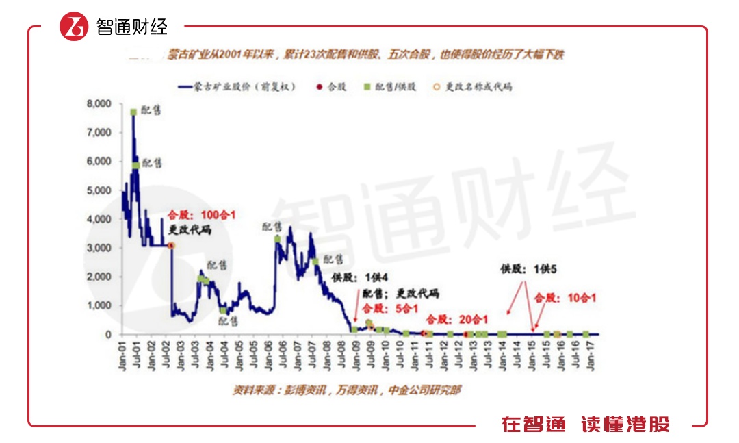 具体来说,2001年以来,蒙古矿业配股多达22次,而供股仅3次,但无一例外也都是大比例供股,如1供4和1供5。配售和供股后的合股同样惊人,2002年9月,蒙古矿业曾经100股合1股,并在合股生效当日更改了股票代码。