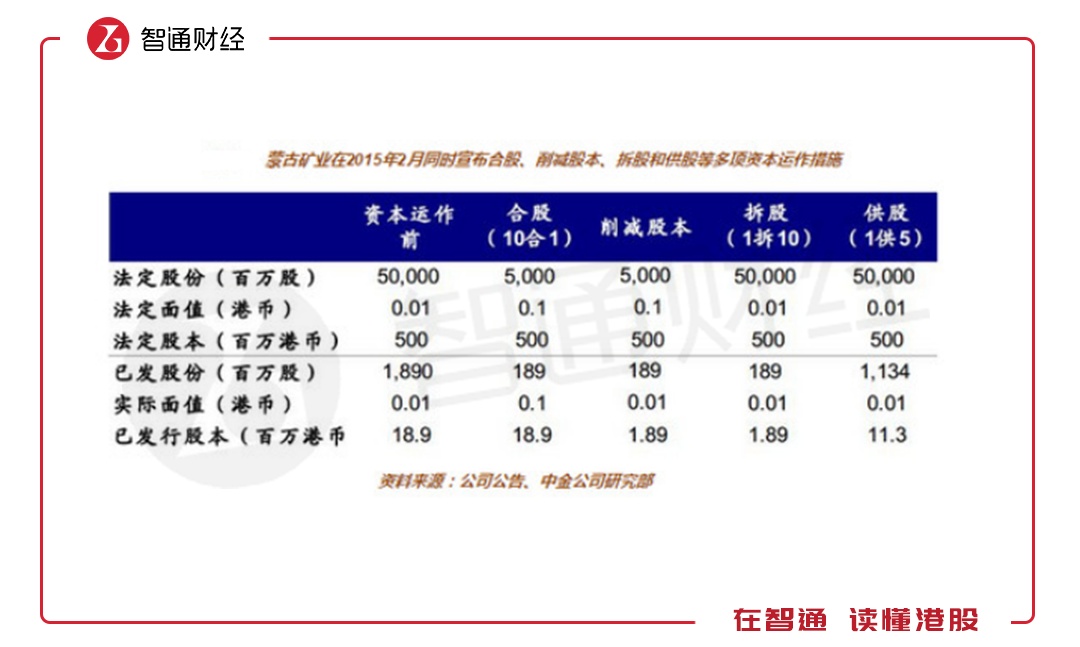 首先是合股,蒙古矿业宣布以10合1的比例合股,进而使得每股法定和实际面值从原来的0.01港币(港交所规定的最低面值)增加10倍至0.1港币,而法定和已发行股份数均缩为原来的十分之一;