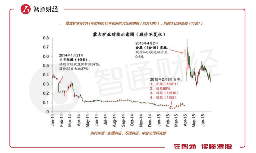 在2014年1月21日,蒙古矿业宣布大比例供股(每1股供5股),供股价格较收盘价折价67%,意味着所有现有股东每持有100元蒙古矿业要拿出167元来参与供股,否则股份就会被摊薄。