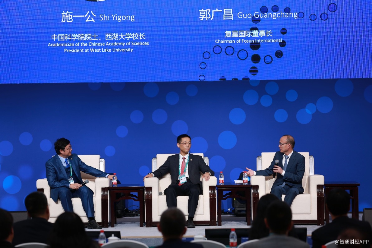 (高峰对话环节:西湖大学副校长许田(左),中国科学院院士、西湖大学校长施一公(中)和复星国际董事长郭广昌(右))