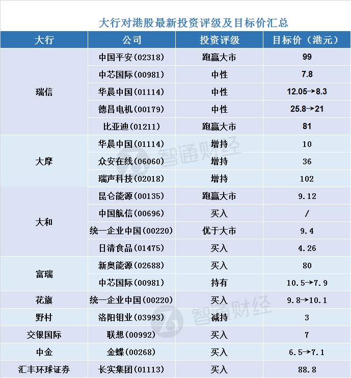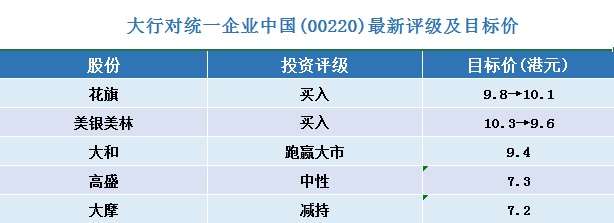 二、大行对统一企业中国(00220)最新投资评级及目标价汇总