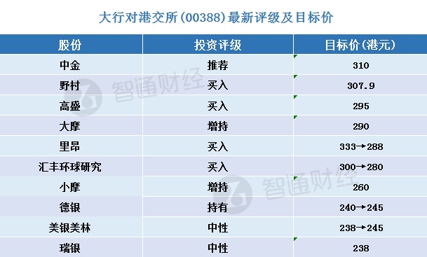 一、大行对港交所(00388)最新投资评级及目标价汇总