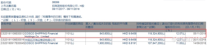 智通财经APP获悉,根据联交所资料显示,COSCO SHIPPING Financial Holdings Co., Ltd于11月5日增持招商证券(06099)84万股,每股作价9.65港元,总值810.6万港元,最新持股量增至12.07%。