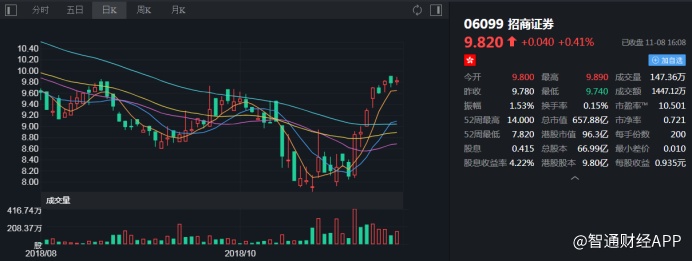 截至今日收盘,招商证券(06099)报9.82港元,涨0.41%。