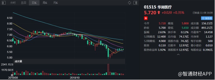 截至今日收盘,华润医疗(01515)报5.72港元,涨0.35%。