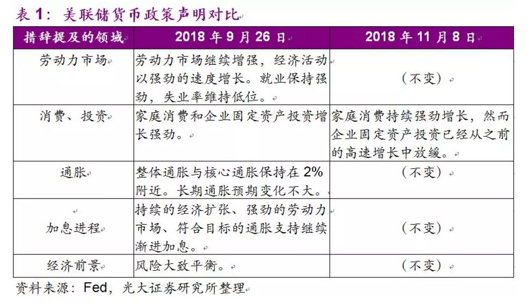 货币政策声明变化不大,但指出投资放缓。与9月相比,此次声明内容大致相同,针对家庭消费和劳动力市场,声明仍然使用了“强劲”的表态。但对企业投资的描述由“强劲增长”改为“已经从之前的高速增长中放缓”。我们认为这主要源于三季度建筑类投资意外下滑(参见报告《超预期,但“一枝独秀”不容易》)。声明并未提及近期金融市场的波动,同时重申将逐步加息(表1)。