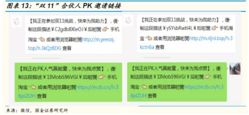 阿里有一颗做社交的心,“双11”合伙人计划反映出其在社交方面的努力:在收集能量的PK和挑战玩法中,参与者需要拉人组队、助力、点赞,这正是利用社交关系传播的一个好的场景。我们可以看到,邀请主要以链接进行,因此微信中不时出现好友邀请助力和点赞的链接。