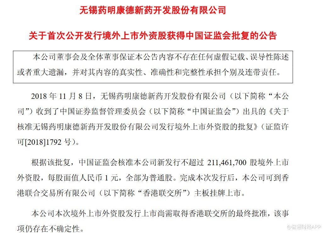 根据该批复,中国证监会核准药明康德新发行不超过2.11亿股境外上市外资股,每股面值人民币1元,全部为普通股。完成本次发行后,药明康德可到香港联交所主板挂牌上市。