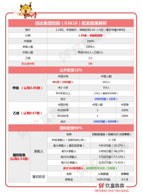 恒达集团控股(03616)今早公布配售结果:定价1.24元,在申购价范围的中间偏上一点点,最近十几个上涨的股票都是下限定价,这货是不是有点膨胀了?公开发售部分认购1.86倍,未触发回拨,1手中签率100%。
