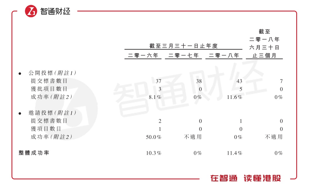 不过,基于财裕集团的投标成功率,财裕集团未来业绩就难以保障。据智通财经APP了解,在2016年、2017年及2018财年,财裕集团的整体投标成功率为10.3%、0%、11.4%。2019财年至今,财裕集团参与了7个公开招标,并无收获。