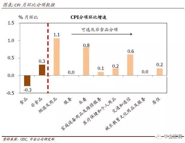 非食品价格小幅上升。10月非食品价格同比增速从上月的2.3%小幅回升至2.4%,月环比涨幅持平于上月的0.3%。分类来看,10月消费品价格月环比上涨0.3%,而服务价格持平。具体来看,10月衣着类价格受季节性因素影响,环比上升0.8%;交通通讯类价格环比上升0.6%,部分由于前期石油价格上升;此外,烟酒类价格环比上升1.1%。