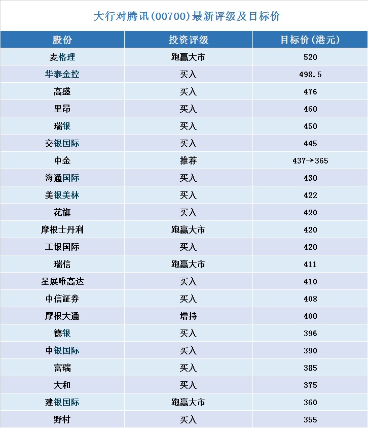 智通财经APP整理,腾讯(00700)最新投资评级及目标价如下: