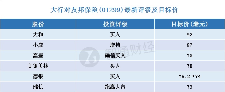 智通财经APP整理,大行对友邦保险(01299)最新投资评级及目标价如下: