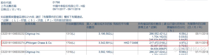 智通财经APP获悉,根据联交所资料显示,摩根大通11月5日减持中国中车(01766)334万股,每股作价7.05港元,总值2364.72万港元,最新持股量降至4.97%。