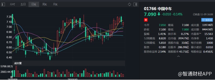 截至今日收盘,中国中车(01766)报7.09港元,跌0.14%。