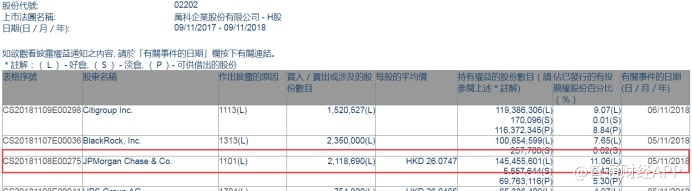 智通财经APP获悉,根据联交所资料显示,摩根大通于11月5日增持万科企业(02202)211万股,每股作价26.07港元,总值5500.77万港元,最新持股量增至4.97%。
