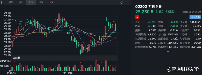 截至今日收盘,万科企业(02202)报25.25港元,跌5.08%。