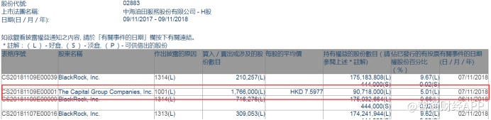 智通财经APP获悉,根据联交所资料显示,The Capital Group于11月5日增持中海油田服务(02883)176万股,每股作价7.60港元,总值1337.6万港元,最新持股量增至5.01%。