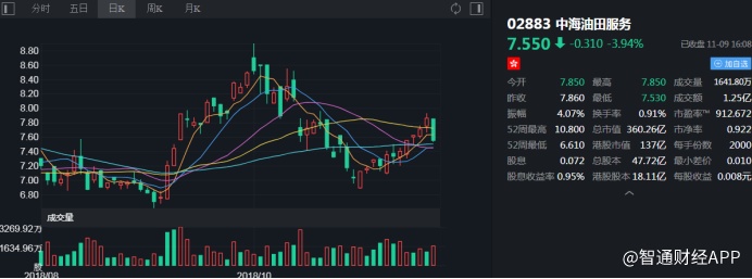 截至今日收盘,中海油田服务(02883)报7.55港元,跌3.94%。