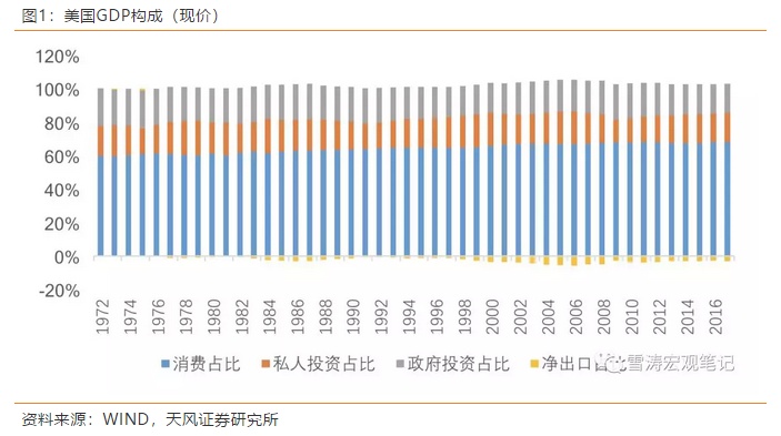 从2017年美国GDP的结构来看,其中消费占GDP比重为68.4%,为美国经济增长提供主要动力。私人投资占比17.28%,政府投资占比17.32%,净出口占比为-2.97%。