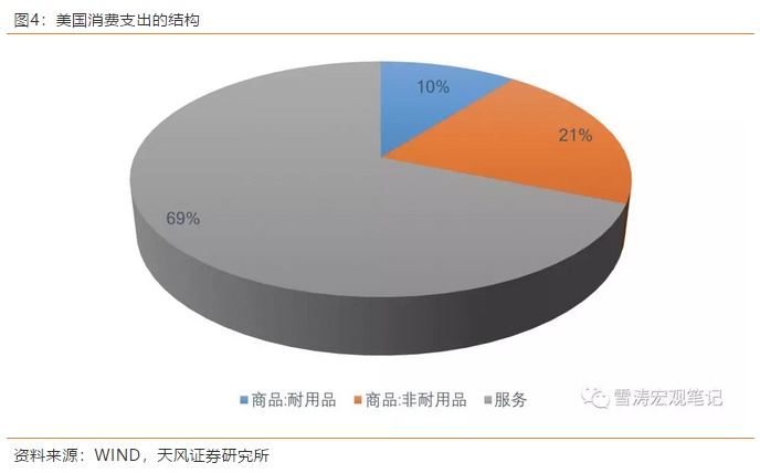 从2017年美国家庭消费支出结构来看,服务消费贡献最大,占比68.8%,耐用品和非耐用品分别占比10.6%和20.6%。今年以来美国消费反弹,三季度同比增速达4%,其中非耐用消费在二季度基础上继续上行达到5.2%,耐用品消费则略有下滑至6.9%,服务消费增速小幅上行至3.2%。