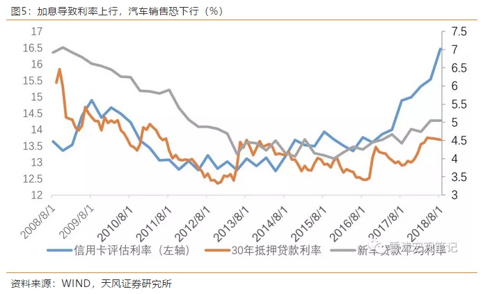 尽管消费者信心指数仍然高企,其他经济活动因升息而收紧的迹象却愈发明显,尤其是对利率敏感的耐用品消费增速将出现下滑。今年初以来,与消费、投资高度相关的新车贷款利率、信用卡评估利率及按揭贷款利率均显著上行,而二季度后房价增速颓势已现,经济活动因升息而收紧的迹象愈发明显。耐用品消费中新车销售未来下滑几成定数。