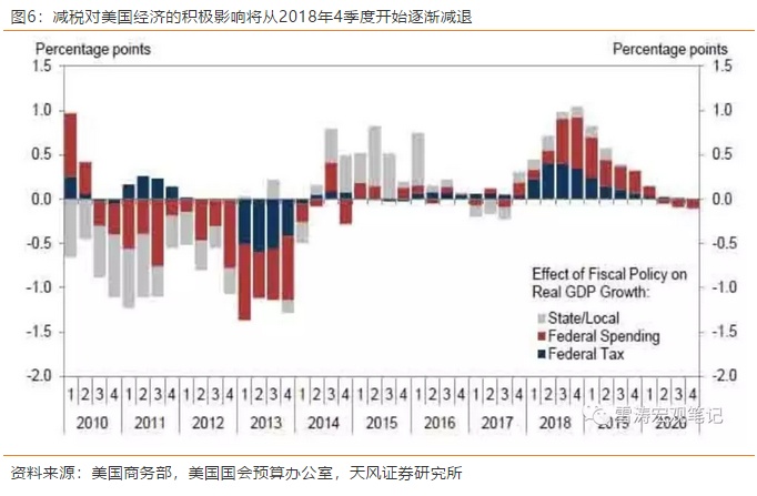 根据美国国会预算办公室(CBO)的预测,减税对美国经济的积极影响将从2018年4季度开始逐渐减退,对GDP的贡献将从4季度的1.1%回落到19年Q1/Q2的0.8%/0.6%(均为年化)。因此明年美国的实际GDP增速将从今年的3.1%回落到2.4%。