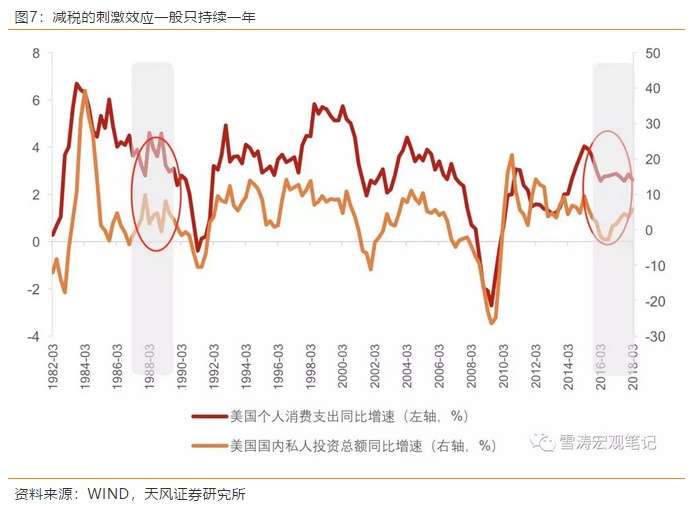 从历史上看,税改红利基本在第一年内最大兑现。1986年里根主导的税改(1986-TRA)分别对企业和个人降税,其中企业减税于1987年开始实施,税率下行持续了两年,私人投资增速的峰值出现在1987年四季度;个人减税实际在1988年开始生效,而消费也在1988年迎来反弹,但进入1989年后,消费增速开始大幅下滑。简而言之,税改的效应一般维持一年。
