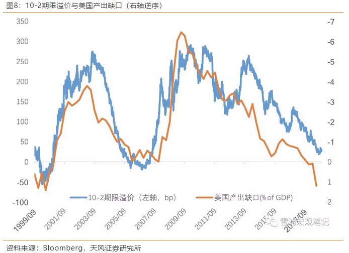 我们在《美债收益率倒挂前后的资产表现》中提到:美股拐点通常发生在美债曲线平坦化之后,美债2*10期限溢价是美股拐点的领先指标,因此期限溢价对美国经济(产出缺口)和标普500指数具有很强的领先性。