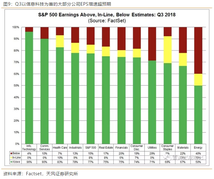 对于美股投资者来说,当前关心的是美国企业明年的EPS增速、今年的收入增速和业绩指引,而非今年的EPS增速。我们在《不立危墙:四季度全球大类资产展望》中指出,由于税改通过成本和回购放大了今年的EPS增速,所以收入增速更好地代表了去除减税和回购影响之外的实际业绩表现。而Q3美股收入增速从今年前两个季度的10%下滑到7.6%,同时众多公司下调收入和盈利的前瞻指引,因此美股投资者担忧明年税改效果减弱后企业盈利跳水。