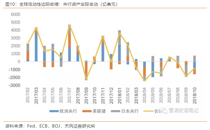 第二,美联储缩表(量化紧缩)将全球资本从经济中抽离,金融危机后的最大受益者,如新兴市场及全球股市,都受到了显著影响,只是今年美国经济的一枝独秀吸引资金流入,部分掩盖了流动性收缩的效应。今年四季度欧央行计划完全退出QE,在日本央行维持先行国债购买规模不变的前提下,全球央行资产规模将持续缩减,到明年将从过去10年来的扩张转为收缩。因此,全球流动性收紧的预期也在同时压制着美股和美债的表现,这也是这一次美股投资者对业绩异常苛刻的原因。