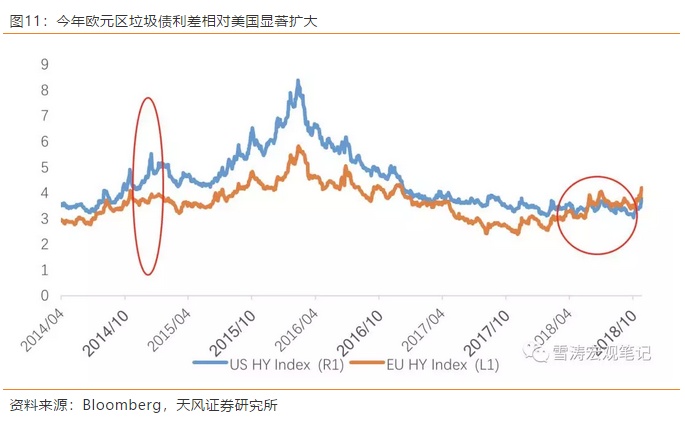至于著名的美股拐点领先指标——垃圾债指数,在今年前九个月一度涨幅2.57%,部分原因是高油价压低了能源板块(占比14.75%)信用利差。作为对比,欧元区垃圾债(能源板块占比1.67%)今年走出了与2014年油价大跌时相反的走势。