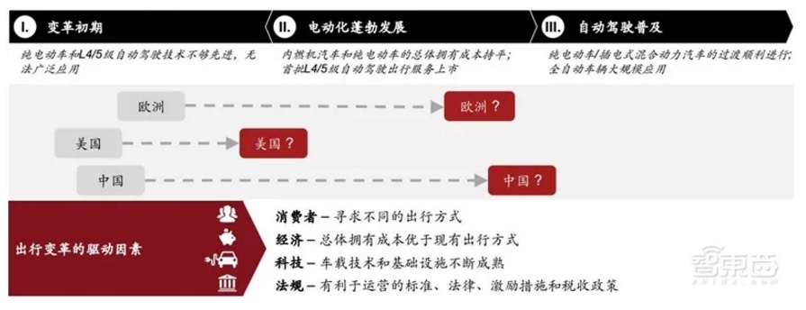 在消费者、经济、科技和法规这四大因素驱动下,出行市场现在正处于深刻的变革之中。而欧洲、美国、中国的出行变革进程各不相同。