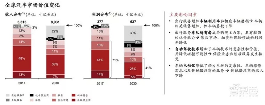 以上一系列趋势的影响下,到2030年,传统供应商、 车辆销售和售后市场的利润份额可能大幅降至41%。而出行服务的利润份额将从12%大幅增长到30%,超过新车销售利润。