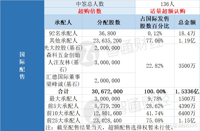 国际配售中签总人数136,适量超额认购,总金额153,360,000。