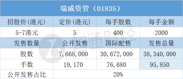智通财经APP获悉,11月12日,瑞威资管(01835)配售结束。配售招股价区间为5-7港元,最终定价5港元,每手2000港元。