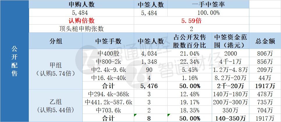 其中,公开配售申购人数5484,一手中签率100%,认购倍数5.59倍。