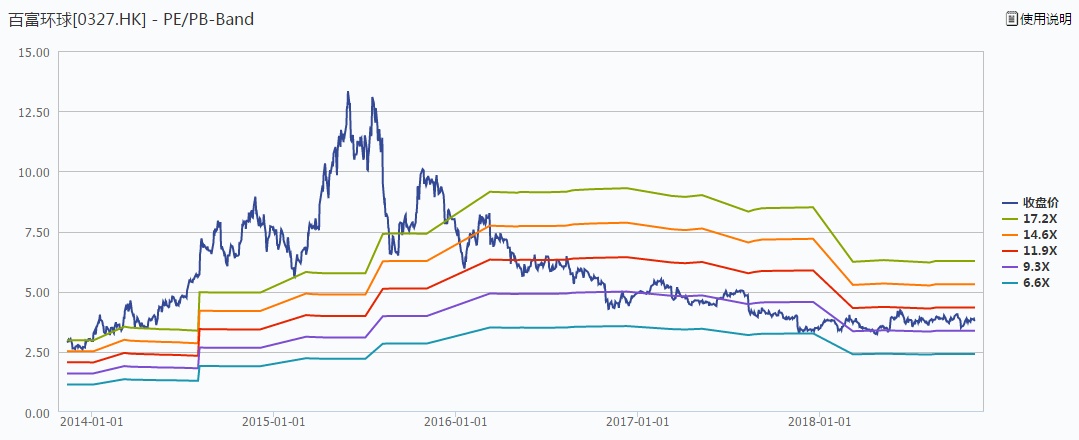 根据联昌国际预计,百富环球目前股价对应2019财年7倍PE,估值具有吸引力。且其过去五年历史PE低位线为6.6倍,现在的PE已接近过去五年最低点。