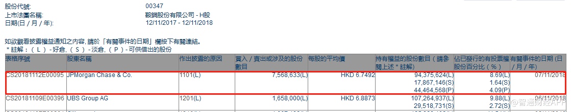 智通财经APP获悉,根据联交所资料显示,摩根大通于11月7日增持鞍钢股份(00347)756万股,每股作价6.7港元,总值5065.2万港元,最新持股量增至8.69%。