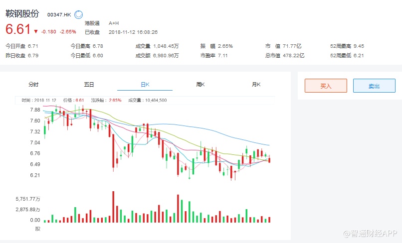 截至今日收盘,鞍钢股份(00347)报6.61港元,跌2.65%。