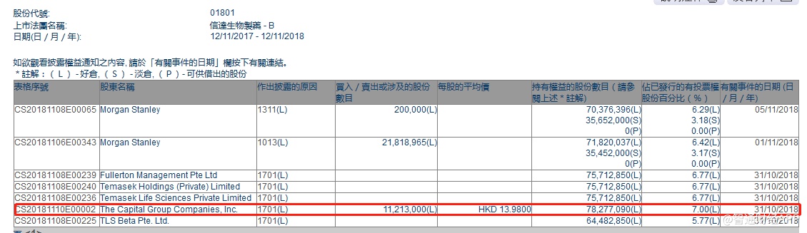 智通财经APP获悉,根据联交所资料显示,The Capital Group于10月31日增持信达生物(01801)1121万股,每股作价13.98港元,总值约1.57亿港元,最新持股量增至7.00%。