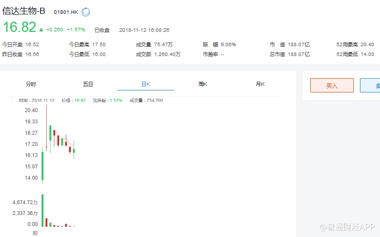截至今日收盘,信达生物(01801)报16.82港元,涨1.57%。