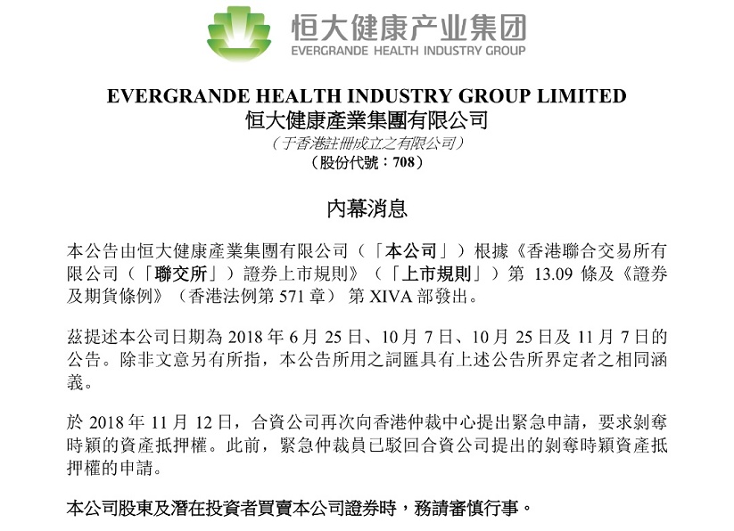 智通财经APP获悉,11月12日,恒大健康(00708)发布公告,贾跃亭再次向香港国际仲裁中心提出紧急仲裁申请,再次要求剥夺恒大的资产抵押权。早在10月18日,贾跃亭就曾提出过同样的申请,并于22日被紧急仲裁员驳回。